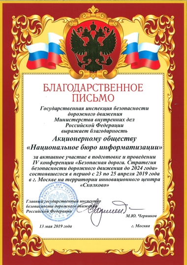Благодарственное письмо АО «НБИ» от Государственной инспекции безопасности дорожного движения Министерства внутренних дел Российской Федерации, 2019 г.