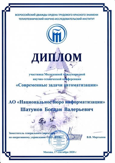 Диплом участника Молодежной международной конференции «Современные задачи автоматизации», 2020 г.