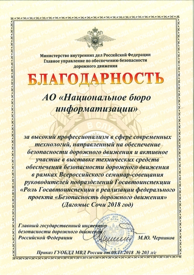 Благодарность АО «НБИ» от Министерства внутренних дел Российской Федерации Главное управление по обеспечению безопасности дорожного движения, 2018 г.